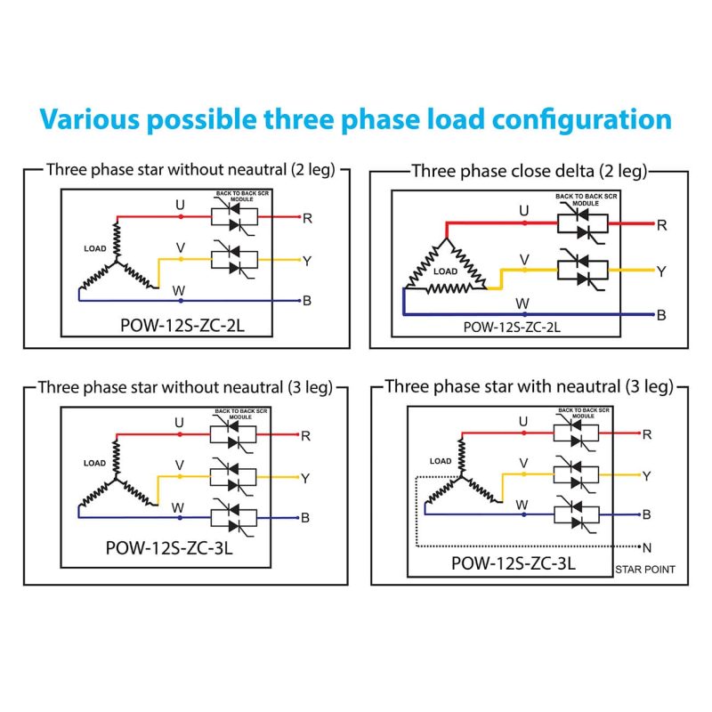 POW-12S-ZC-3L – Three Phase SCR Power Switch suitable for Three Phase Heaters connected in 3 Wire Star without Neutral or 3 Wire Star with Neutral with 3 leg control (1.5KW/3A to 18KW/30A @ 415VAC).